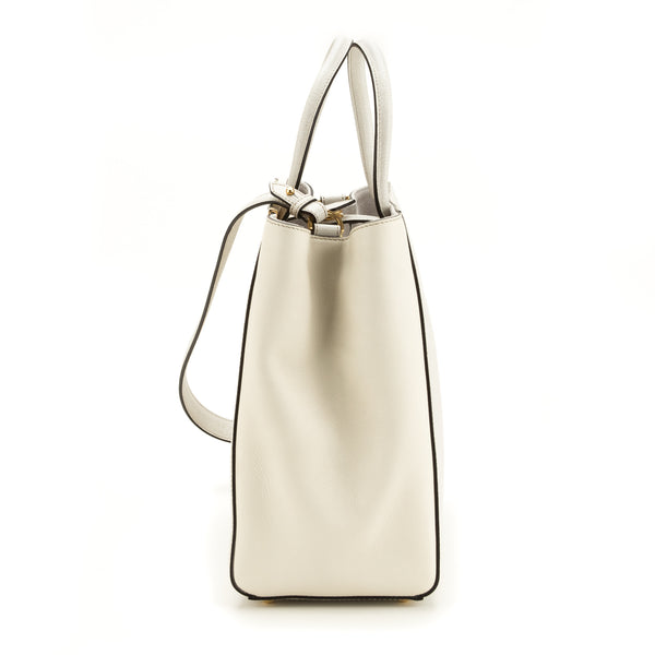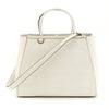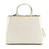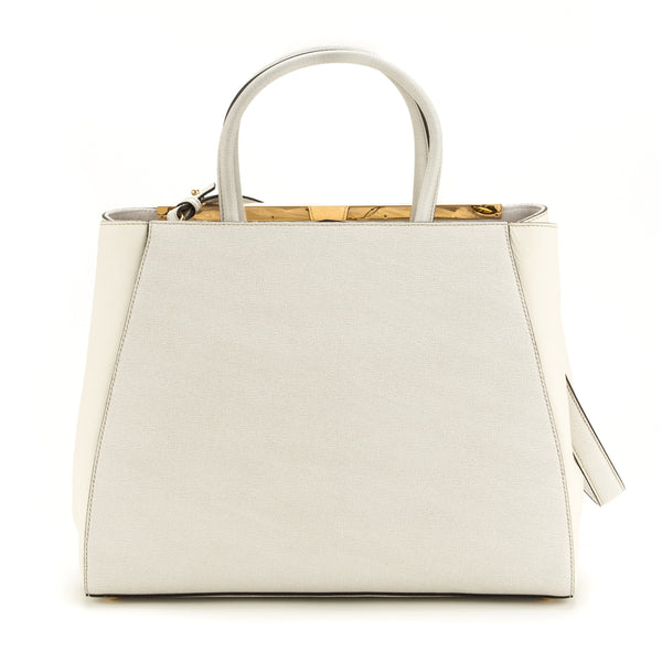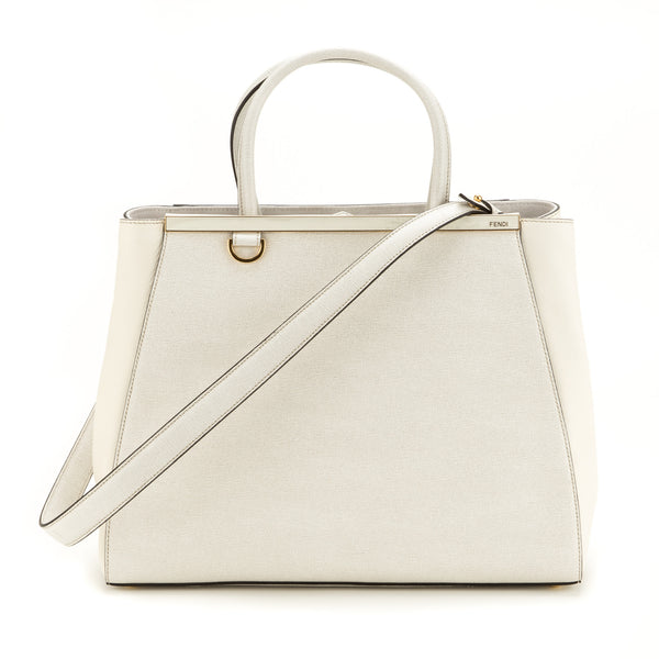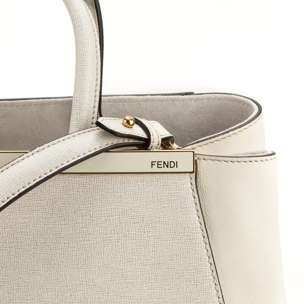 Saffiano leather front, back, and bottom; soft Vitello pebbled leather sides. Palladium hardware. Rolled tote handles; 5" drop; removable shoulder strap; 13 1/2" drop. Open top with snap-button tab closure. Top front enamel bar with Fendi logo lettering. Hanging leather and enamel ID tag. Center zip compartment creates two open compartments. Inside, two open pockets. Fendi striped fabric lining. Metal feet protect bag. 11"H x 14"W x 5"D. Bag weighs approx. 2lbs. Made in Italy.