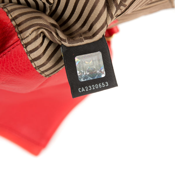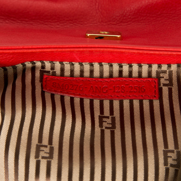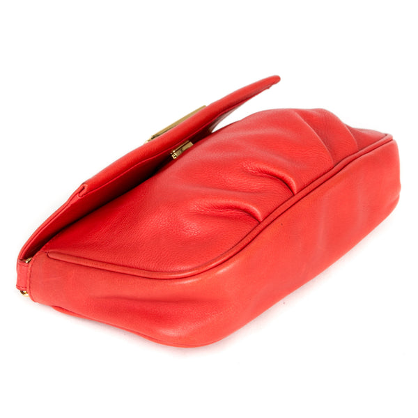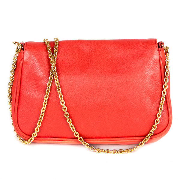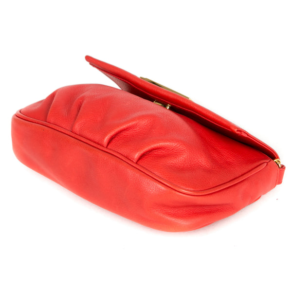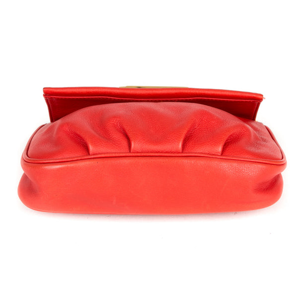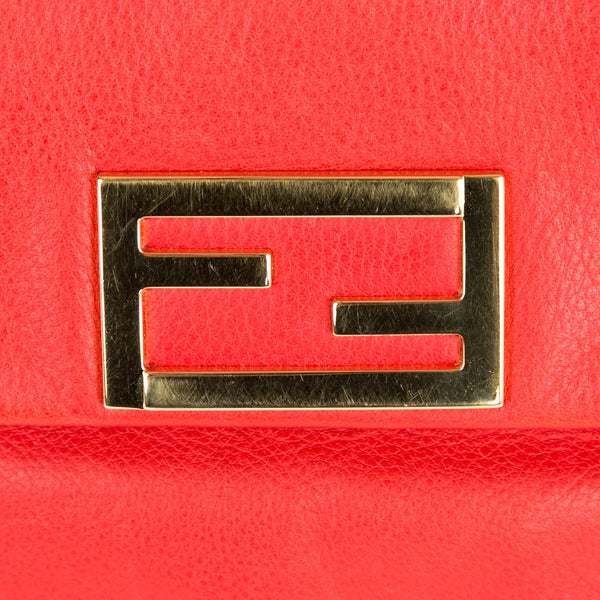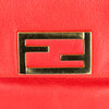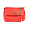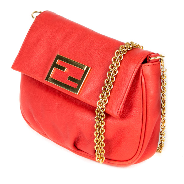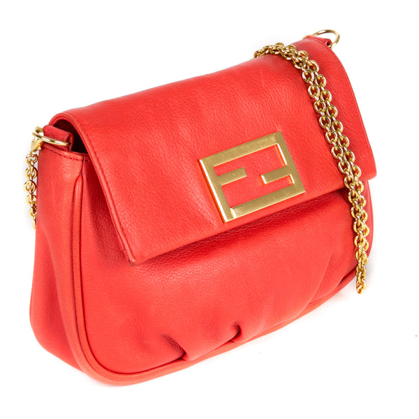 This authentic pre owned Fendi Leather Crossbody Pochette features orange leather, golden hardware, flap top with Fendi logo has magnetic closure, interior striped fabric lining; open pocket.This petite Fendi bag wears a jewelry-like chain you'll love to drape over your shoulder .Authentic: Pre Owned