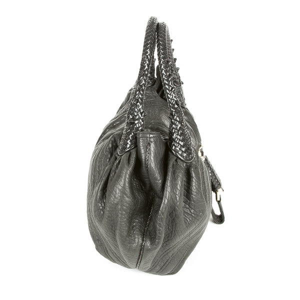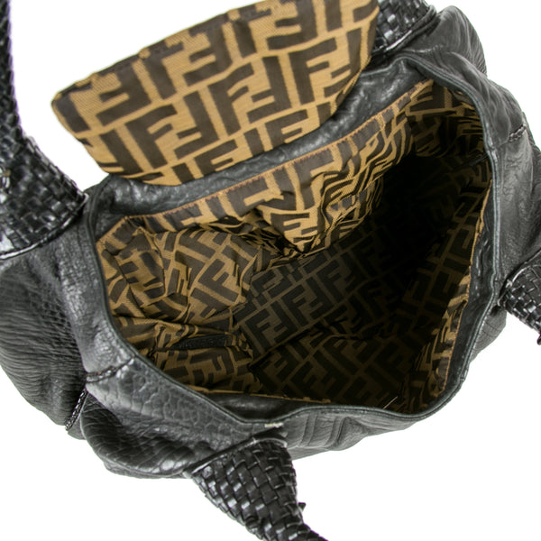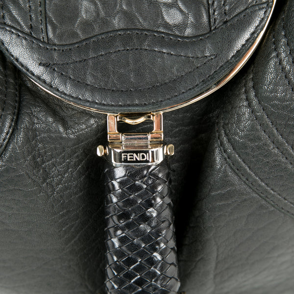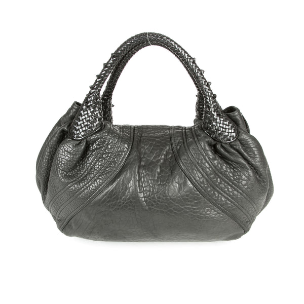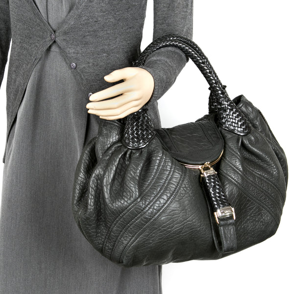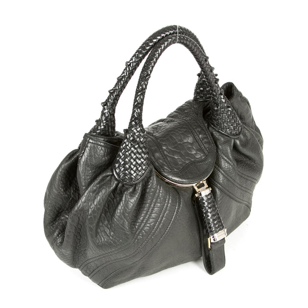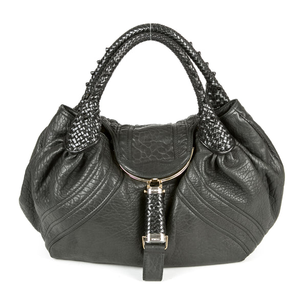 This authentic Fendi Leather Spy Handbag in a rich black color is stunning! This amazing bag features a black leather exterior. There is a hidden compartment on the flap closure and another hidden compartment on the handle and a clasp closure. The interior is monogram canvas and spacious!Authentic: Preowned