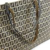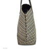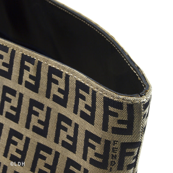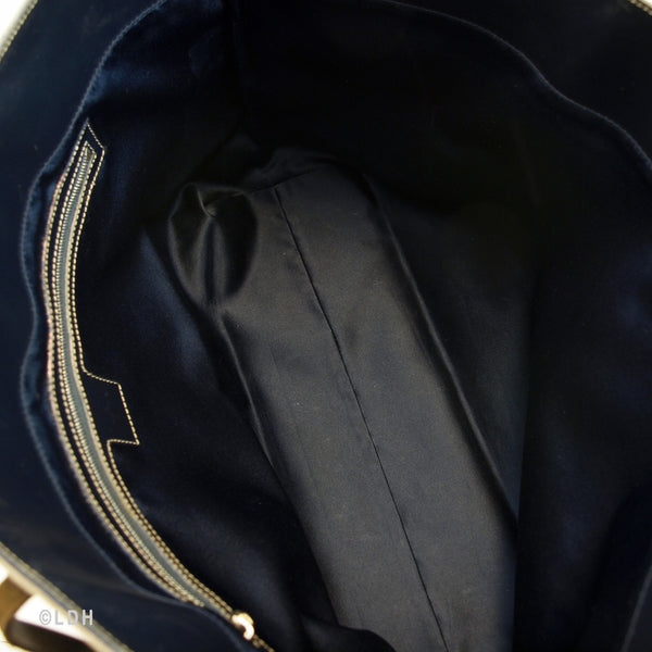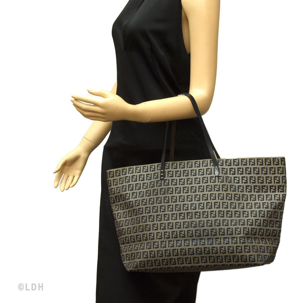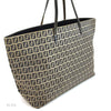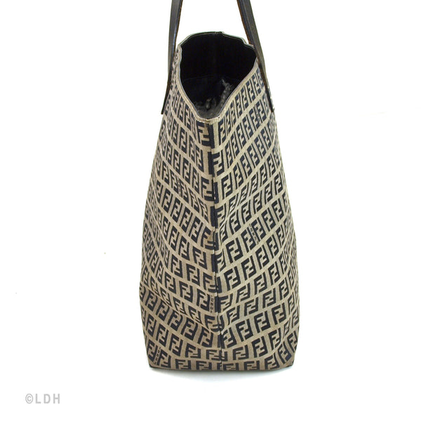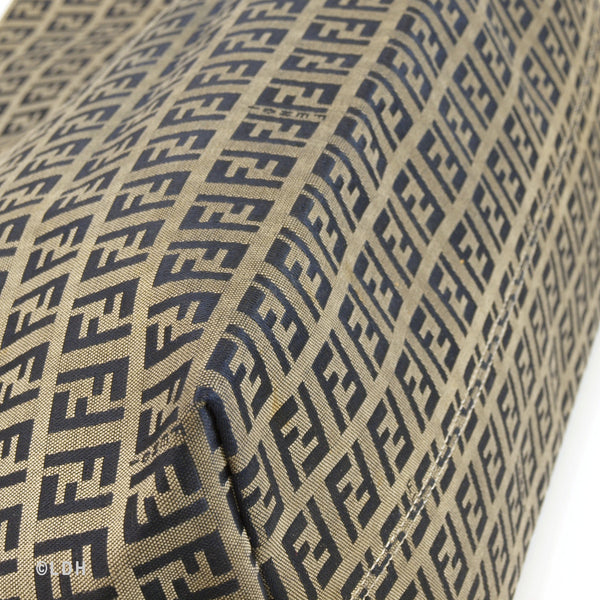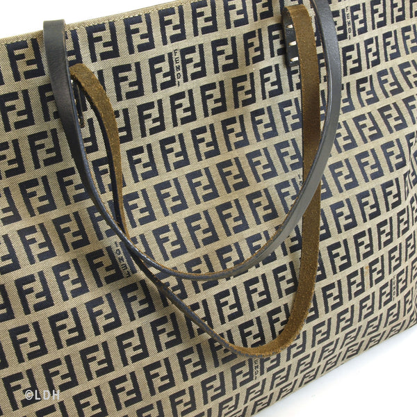 This authentic pre owned Fendi Zucca Tote features the classic FF mono exterior with dark blue leather trimmings. One open side pocket with zipper. Silver tone hardware and dark blue leather strap.Authentic: Pre Owned