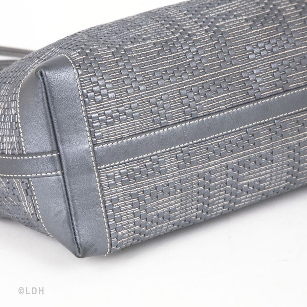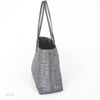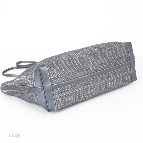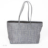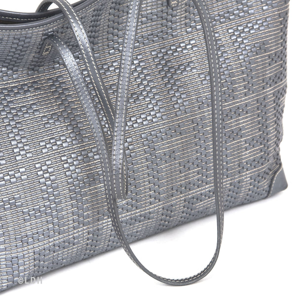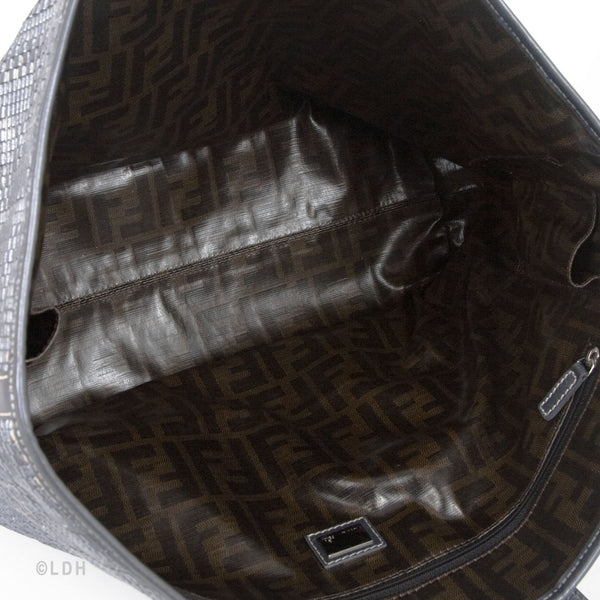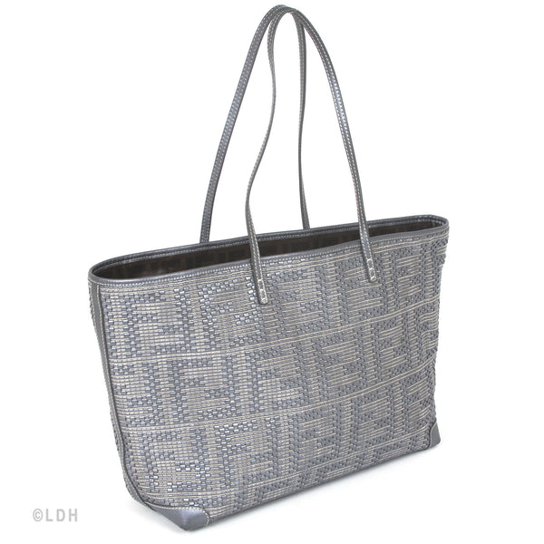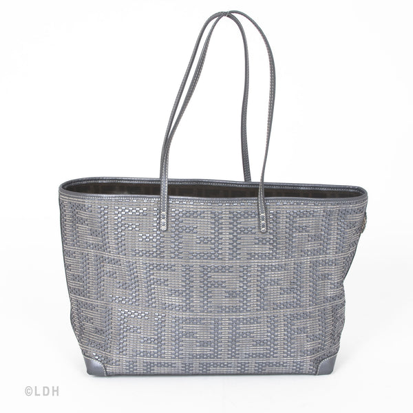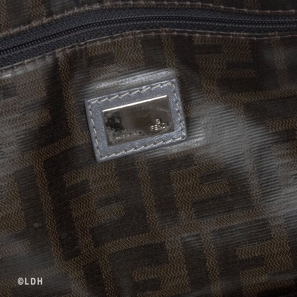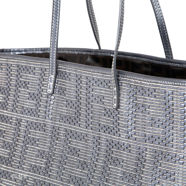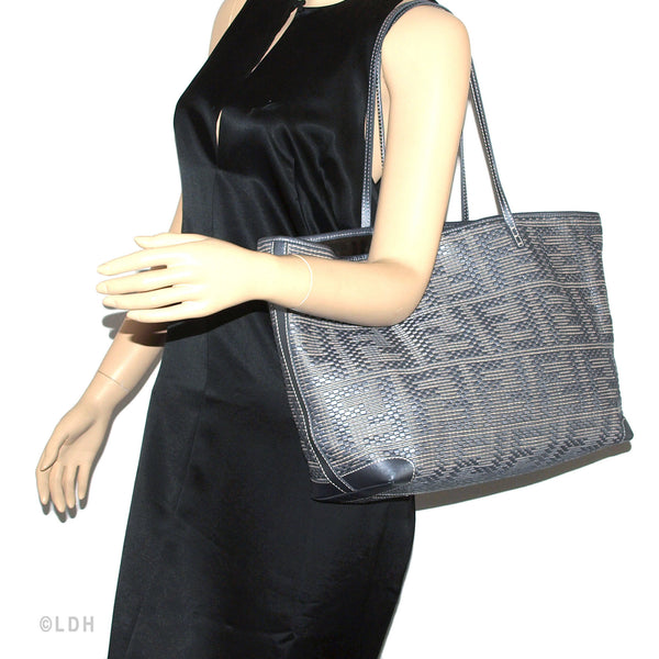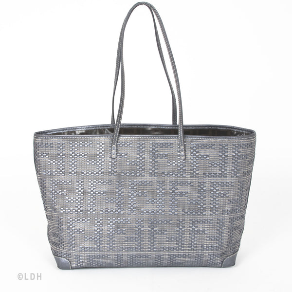 This authentic pre owned Fendi Zucca Tote features the classic FF mono exterior with silver leather trimmings. One side pocket and leather handles. Silver tone hardware.Authentic: Pre Owned