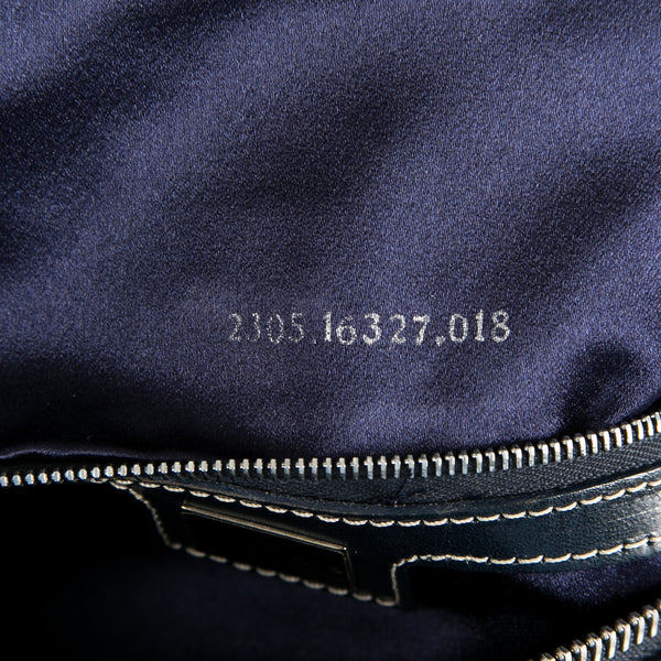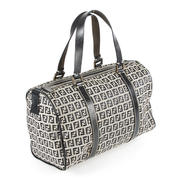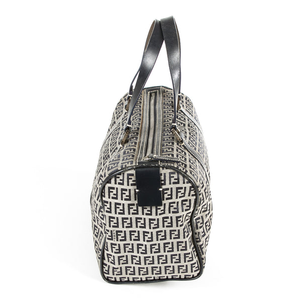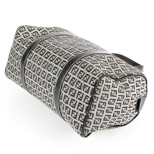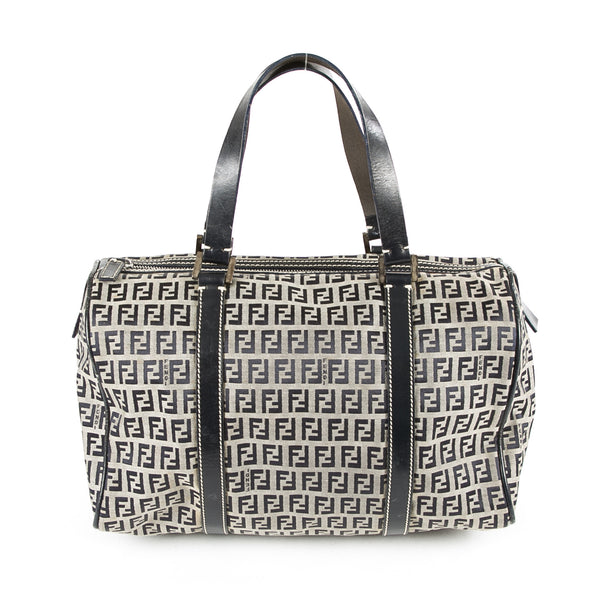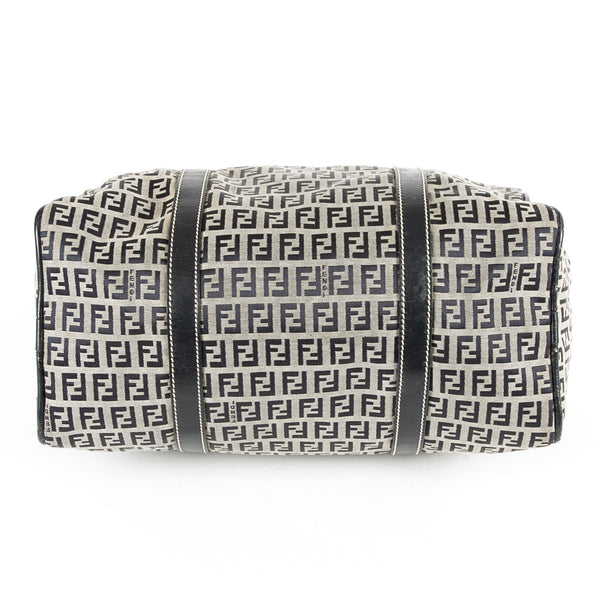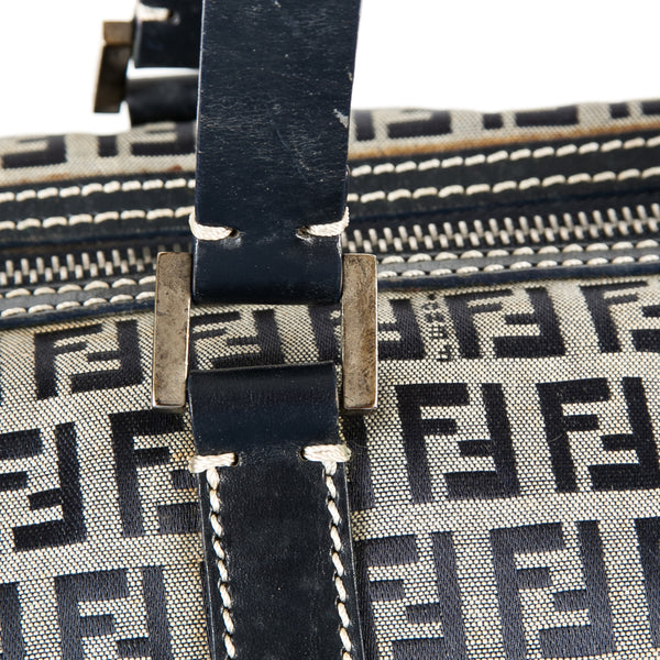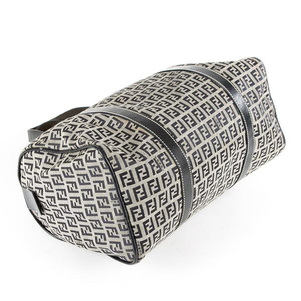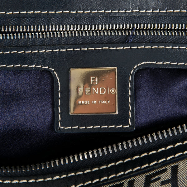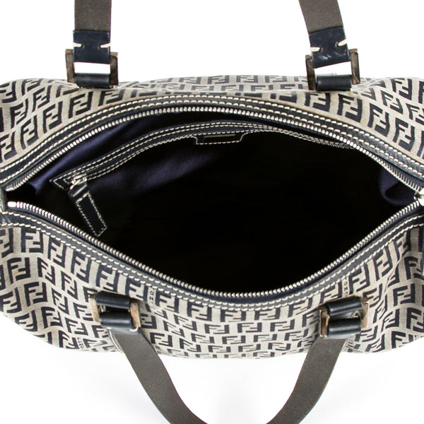 This is an authentic pre owned Fendi Zucchino Bag. Top zipper closure with the signature logo pull. This Fendi Zucchino Bag is a stylish bag with the Zucchino small Fendi logo fabric. This tote bag features navy blue Zucchino on gray fabric, blue leather handles and trimming as well as gold-toned Fendi logo. A great one were you can put all your belongings.Authentic: Pre Owned