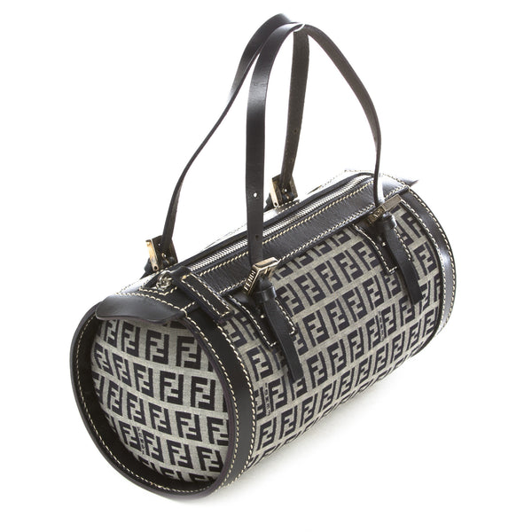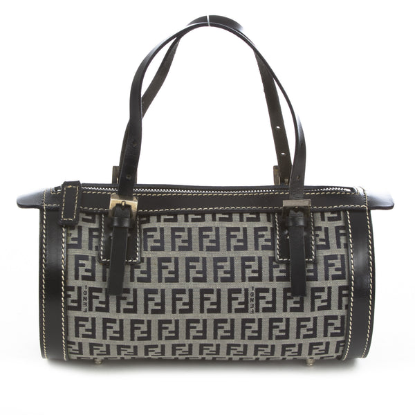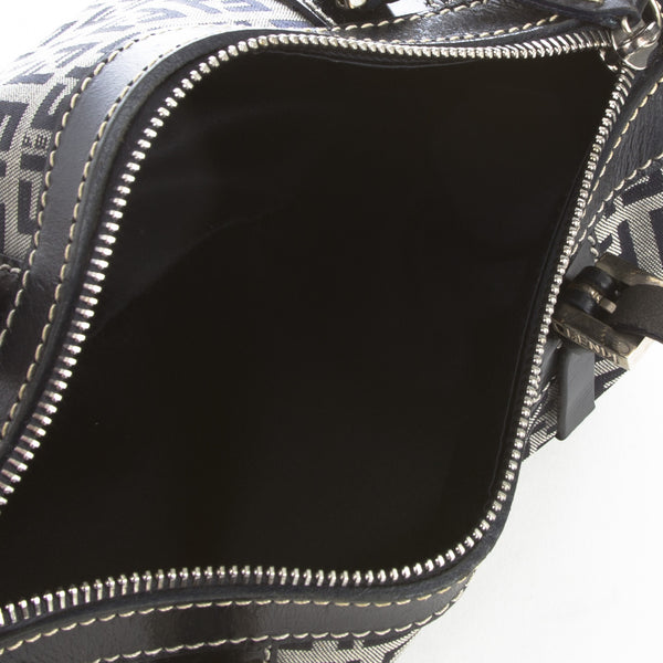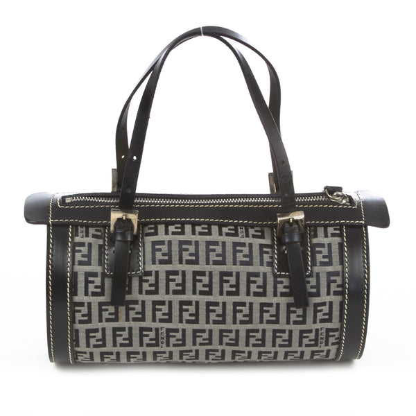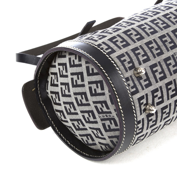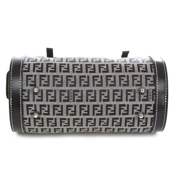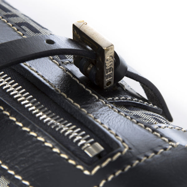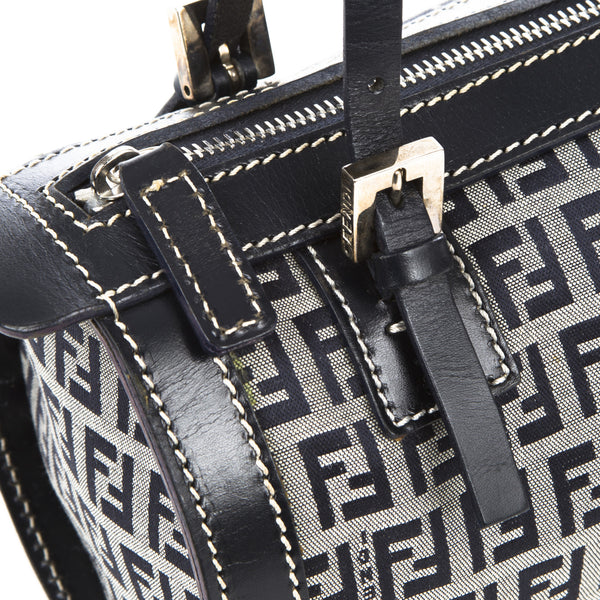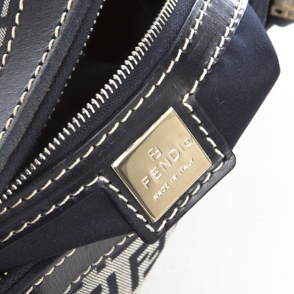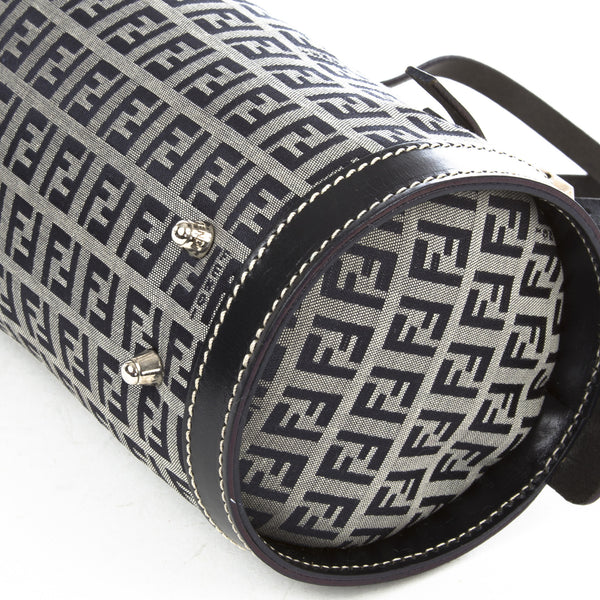 This is an authentic Fendi Zucchino Canvas Navy Bag. It is made of the Fendi monogram in blue canvas with a blue leather trim and straps. It has a blue interior lining. It has silver tone hardware and a zipper top closure.Authentic: Preowned