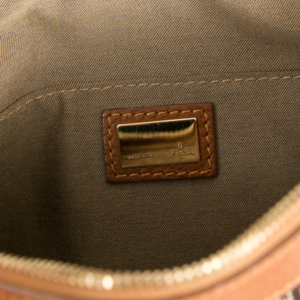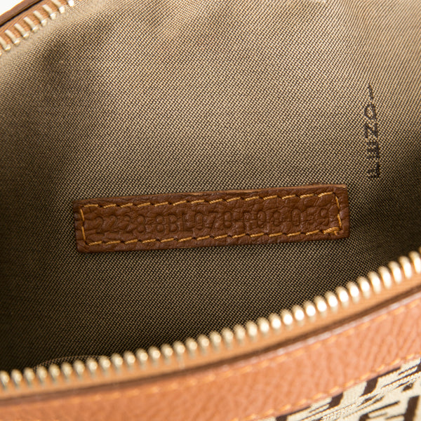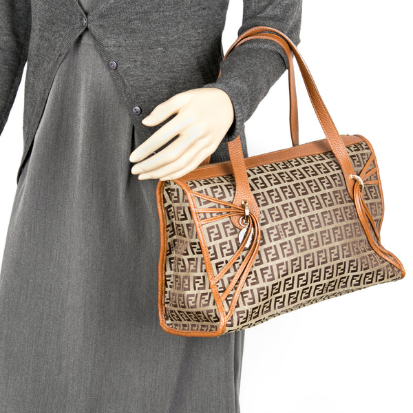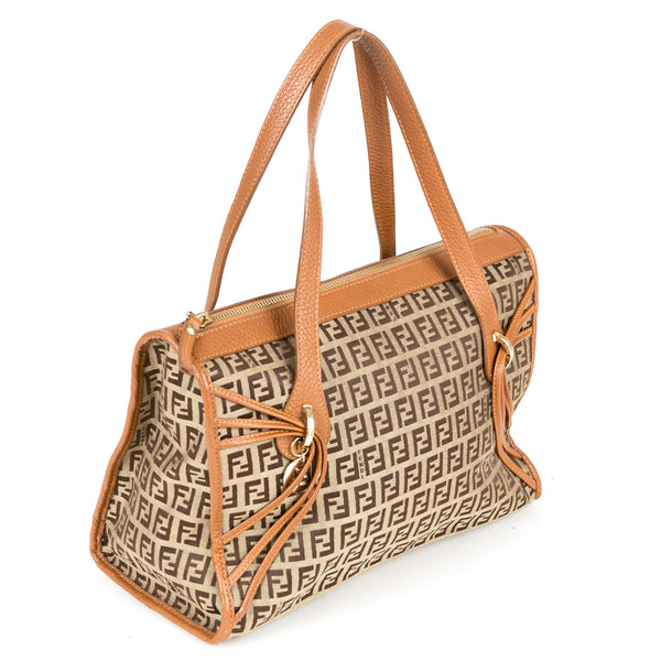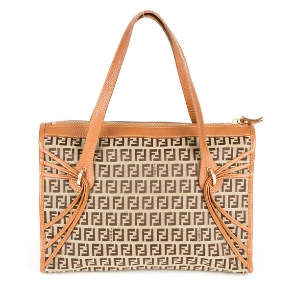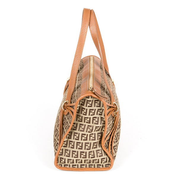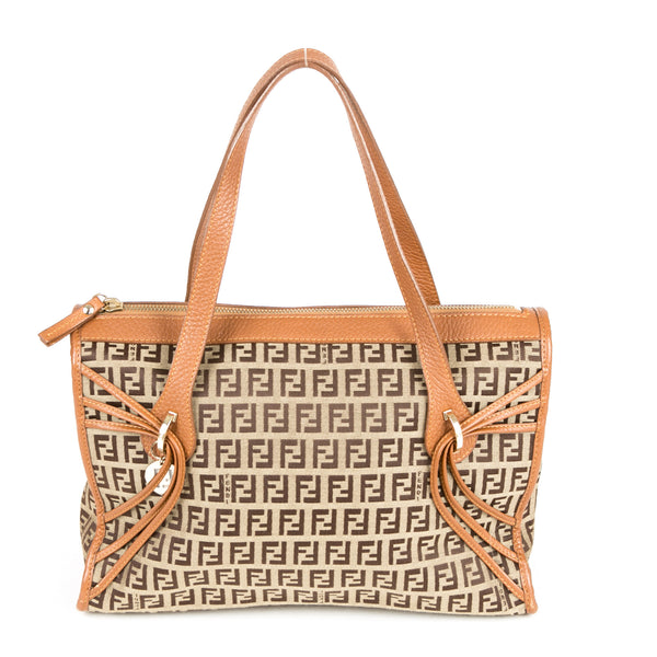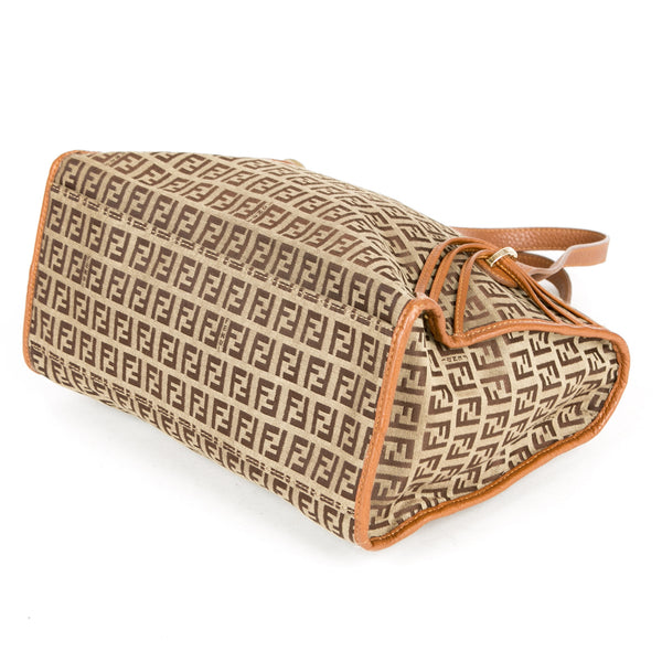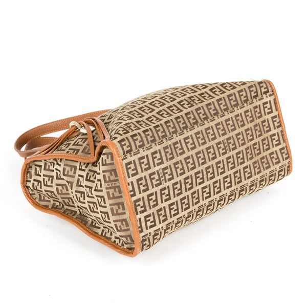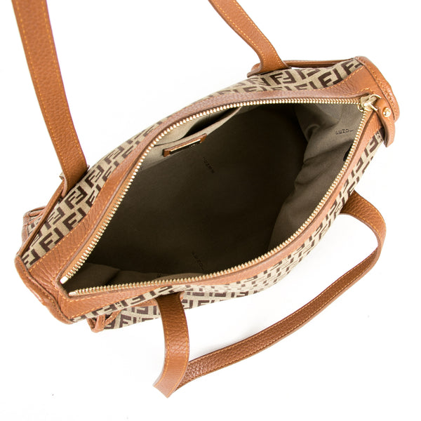 This authentic pre owned Fendi Zucchino Shoulder Bag features the classic FF mono exterior with brown leather trimmings and nylon canvas Top zipper closure with the signature logo pull. This Fendi Zucchino Shoulder Bag is a stylish bag with the Zucchino small Fendi logo fabric. This bag features dark brown Zucchino on beige fabric brown leather handles and trimming as well as gold-toned Fendi logo. A great bag were you can put all your belongings.Authentic: Pre Owned