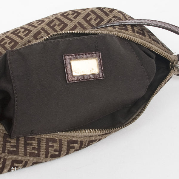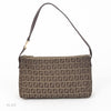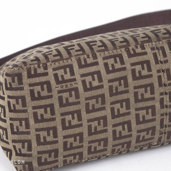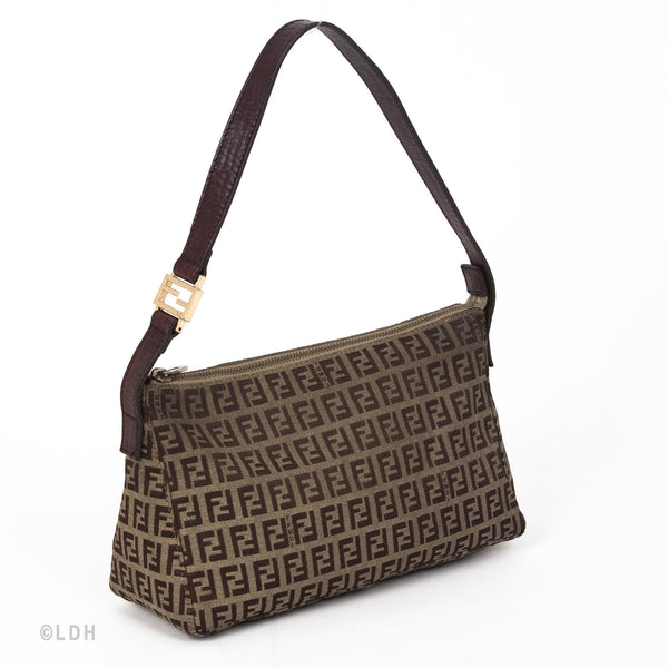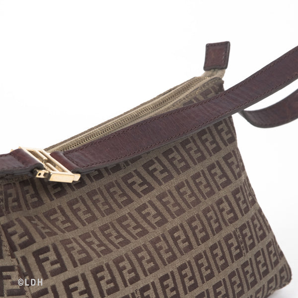 This authentic pre owned Fendi Shoulder Zuccino Bag features the classic Fendi mono canvas exterior and leather top handle with lovely gold tone hardware. Brown leather trimmings and top zip closure. A perfect find for the Fendi lover in you.
