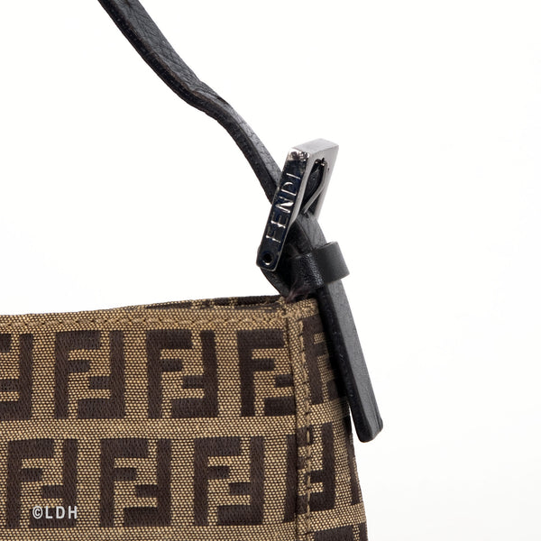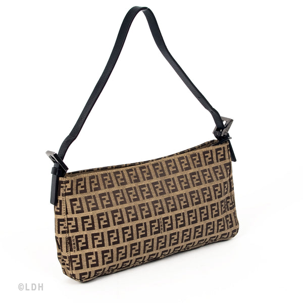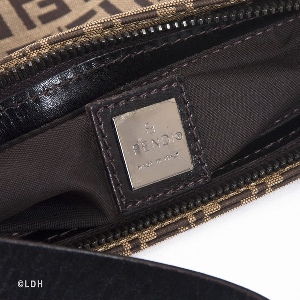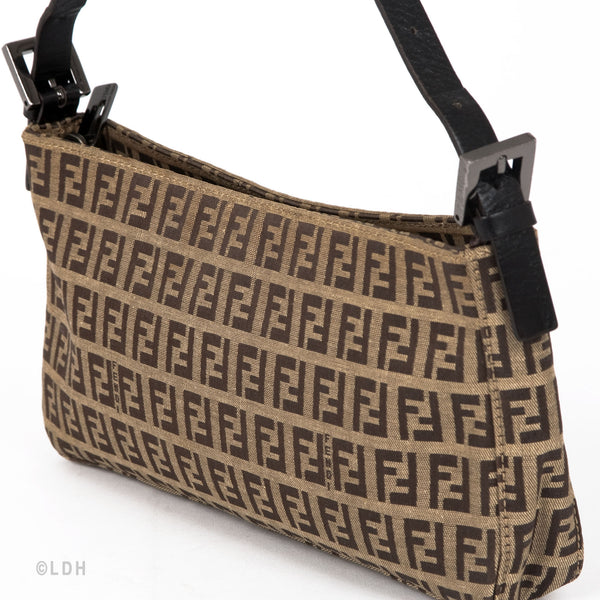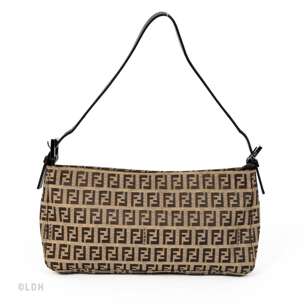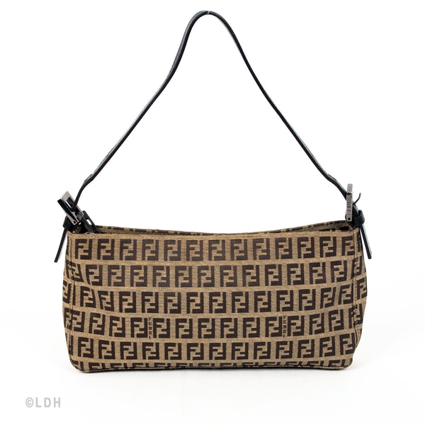 This authentic pre owned Fendi Shoulder Zuccino Bag features the classic Fendi mono canvas exterior and leather top handle with lovely ochre tone hardware. Brown leather trimmings and top zip closure. A perfect find for the Fendi lover in you.Authentic: Pre Owned