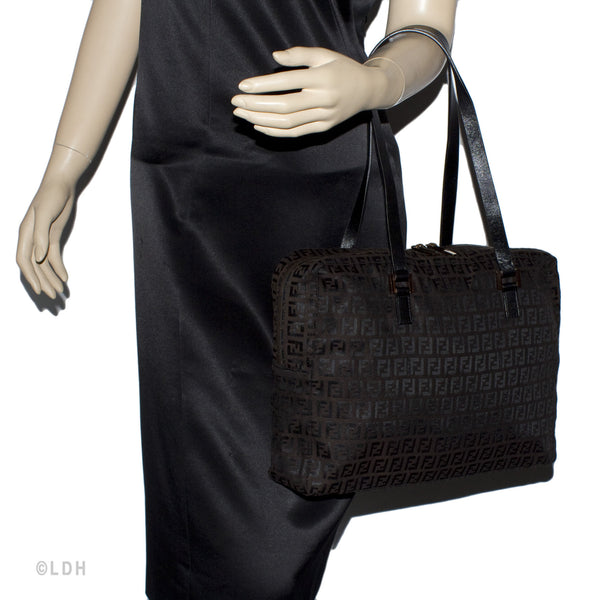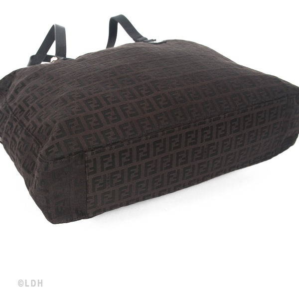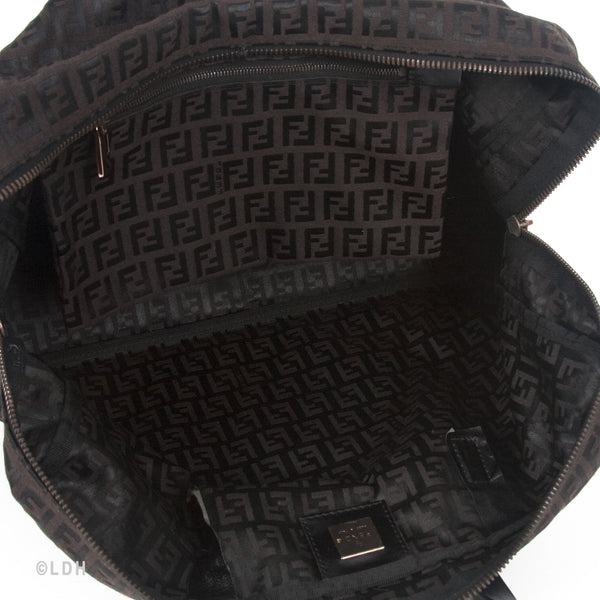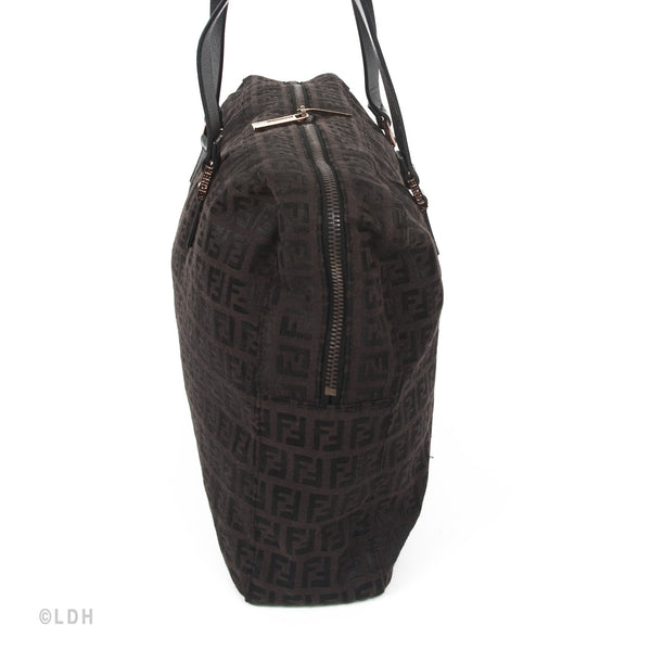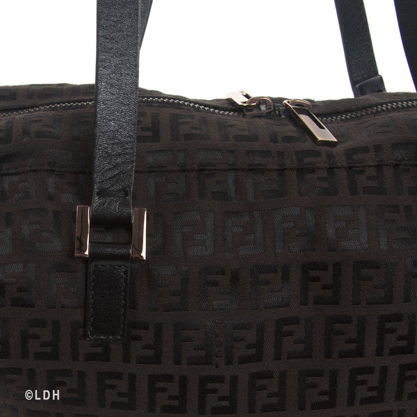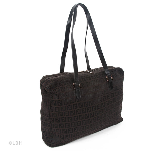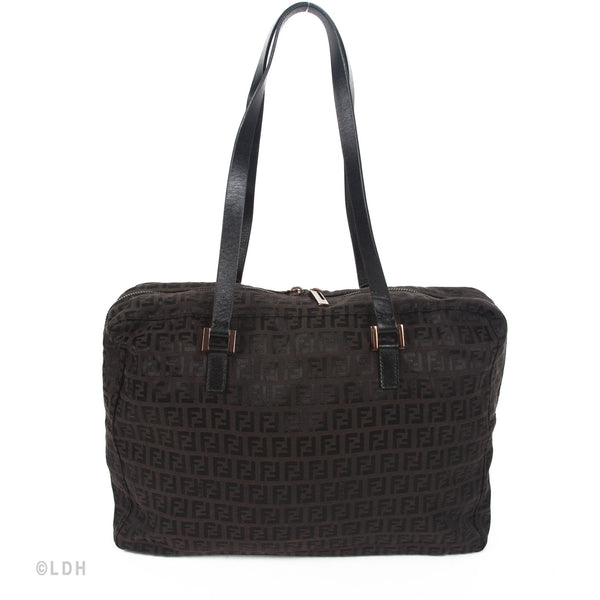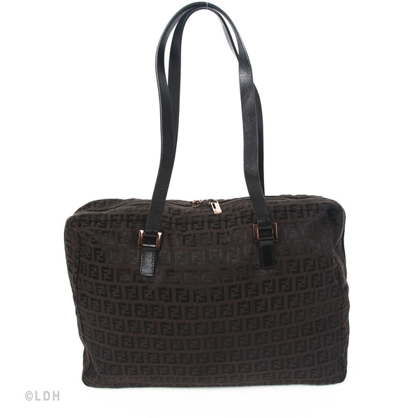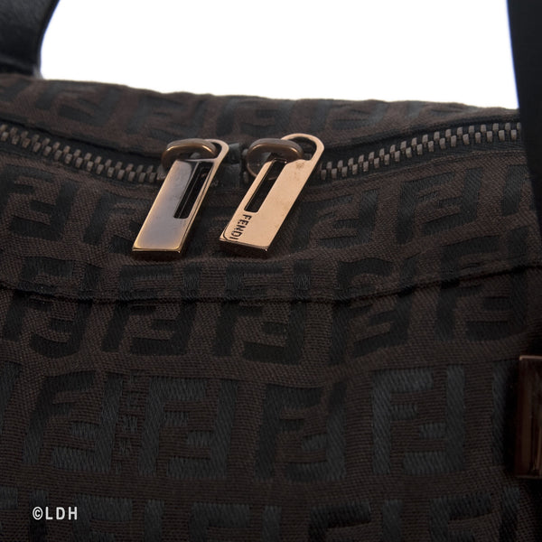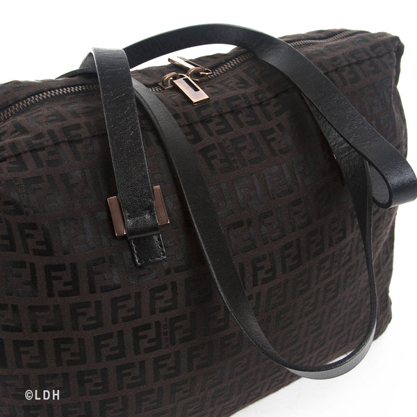 This authentic pre owned Fendi Shoulder Zuccino Bag features the classic Fendi mono canvas exterior and leather top handles with lovely gold tone hardware. Brown leather trimmings and top zip closure. A perfect find for the Fendi lover in you.