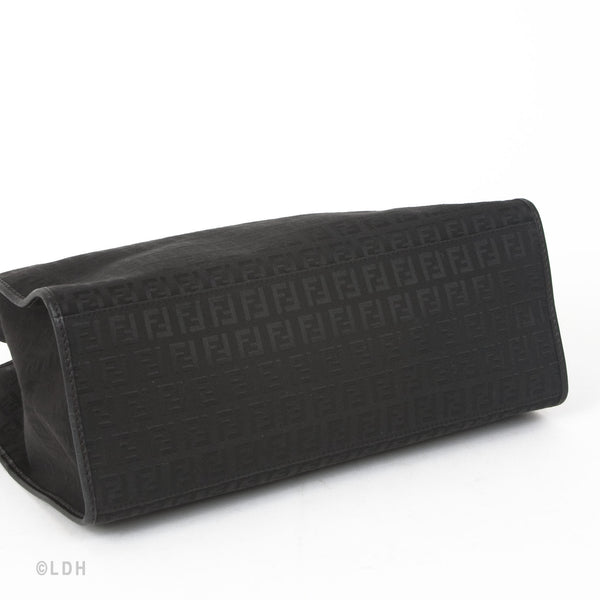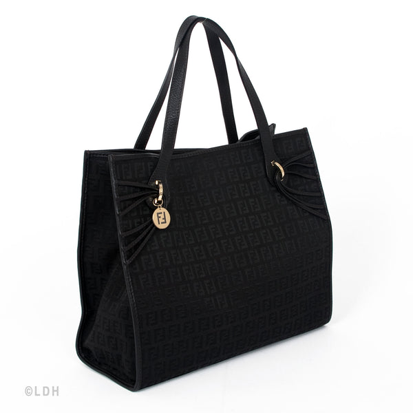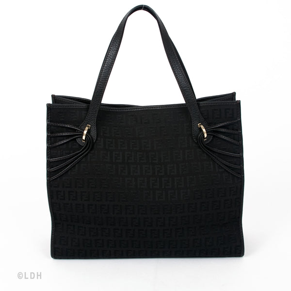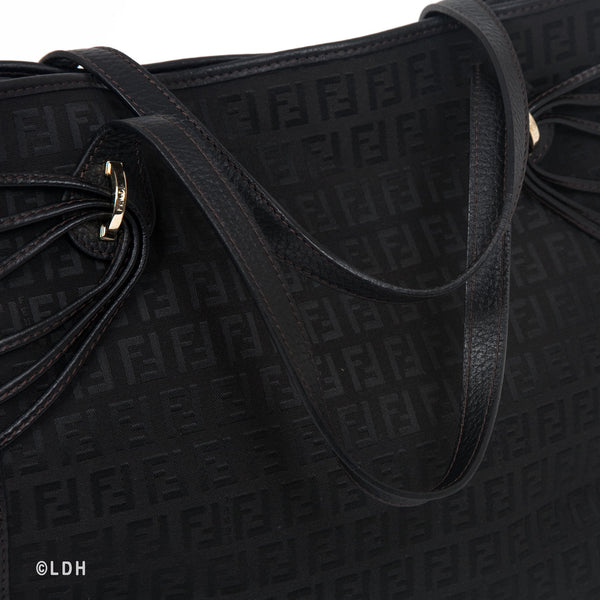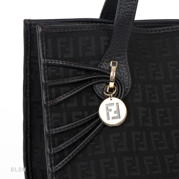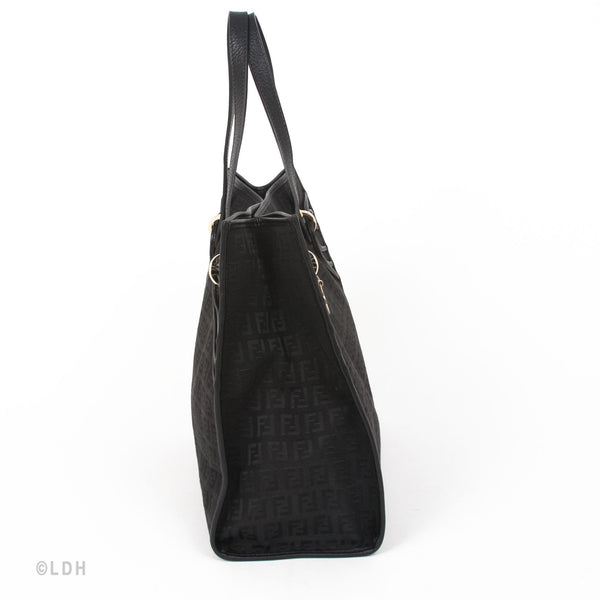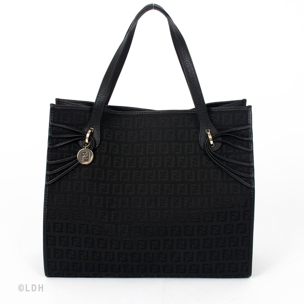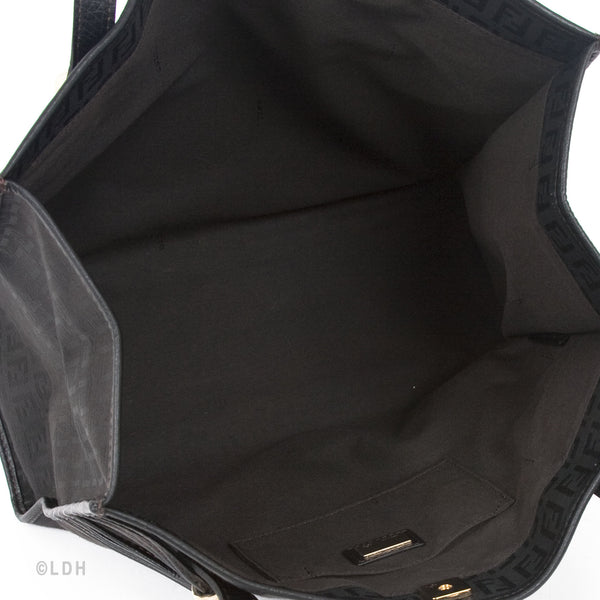 This authentic pre owned Fendi Zucca Tote features the classic FF mono exterior with black leather trimmings one open pocket with snap and gold tone hardware.Authentic: Pre Owned