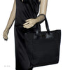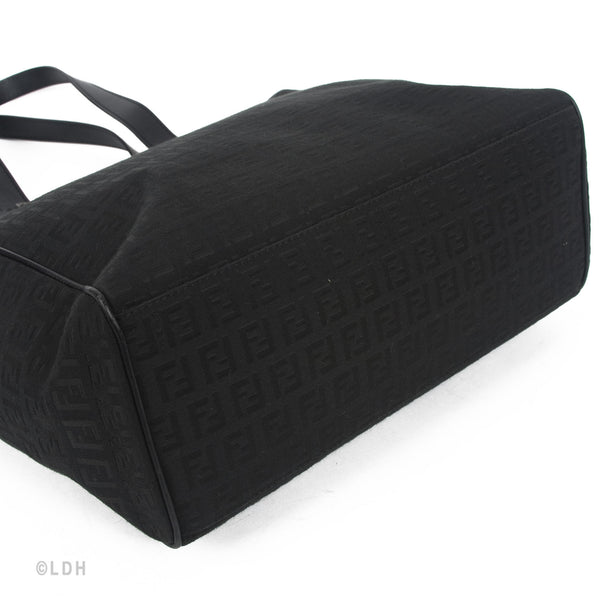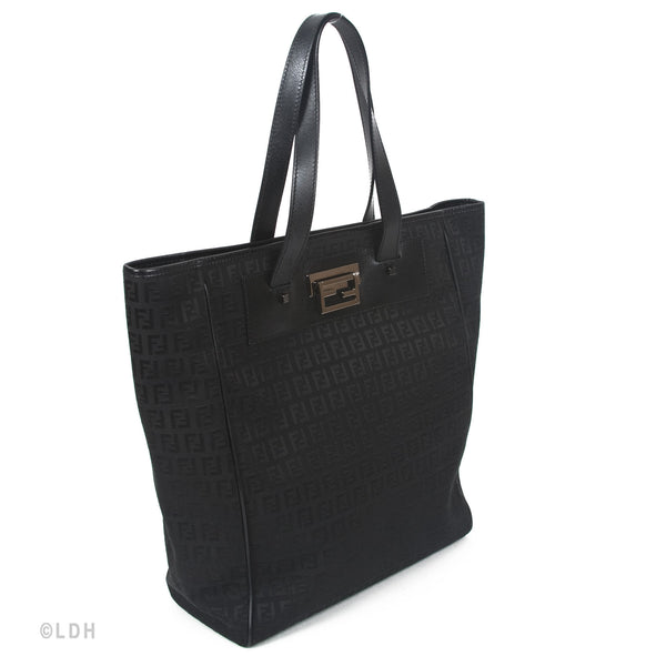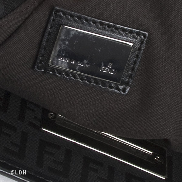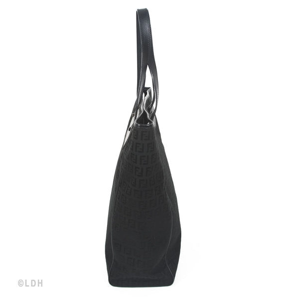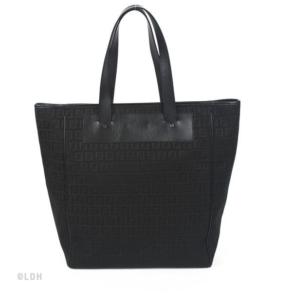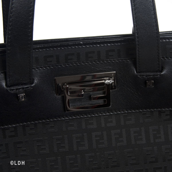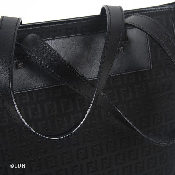 This authentic pre owned Fendi Zuccino Tote features the classic FF mono exterior with black leather trimmings one middle pocket with a zipper and silver tone hardware.